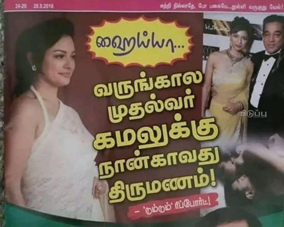 "ஹைய்யா... வங்கால முதல்வர் கமலுக்கு நான்காவது திருமணம் - டும்டும்டும் ரிப்போர்ட்" என்று பதிவிடப்பட்டிருக்கிறது. ஏற்கனவே பூஜா குமாருக்கும் இடையே ரகசிய உறவு என்றும் அதன்பின் பூஜா குமார் வேறொருவரை திருமணம் செய்து குழந்தை பெற்றது குறிப்பிடத்தக்கது. இந்த போஸ்டர் தற்போது இணையத்தில் கசிந்துள்ளது.