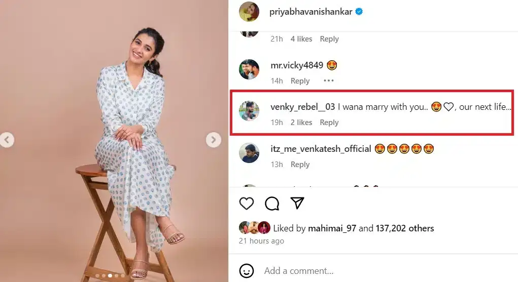 அந்த அளவுக்கு பிரியா பவானி சங்கரின் அழகில் மயங்கி ரசிகர்கள் அவரை வர்ணித்து கமெண்ட் செய்து வருகிறார்கள் .