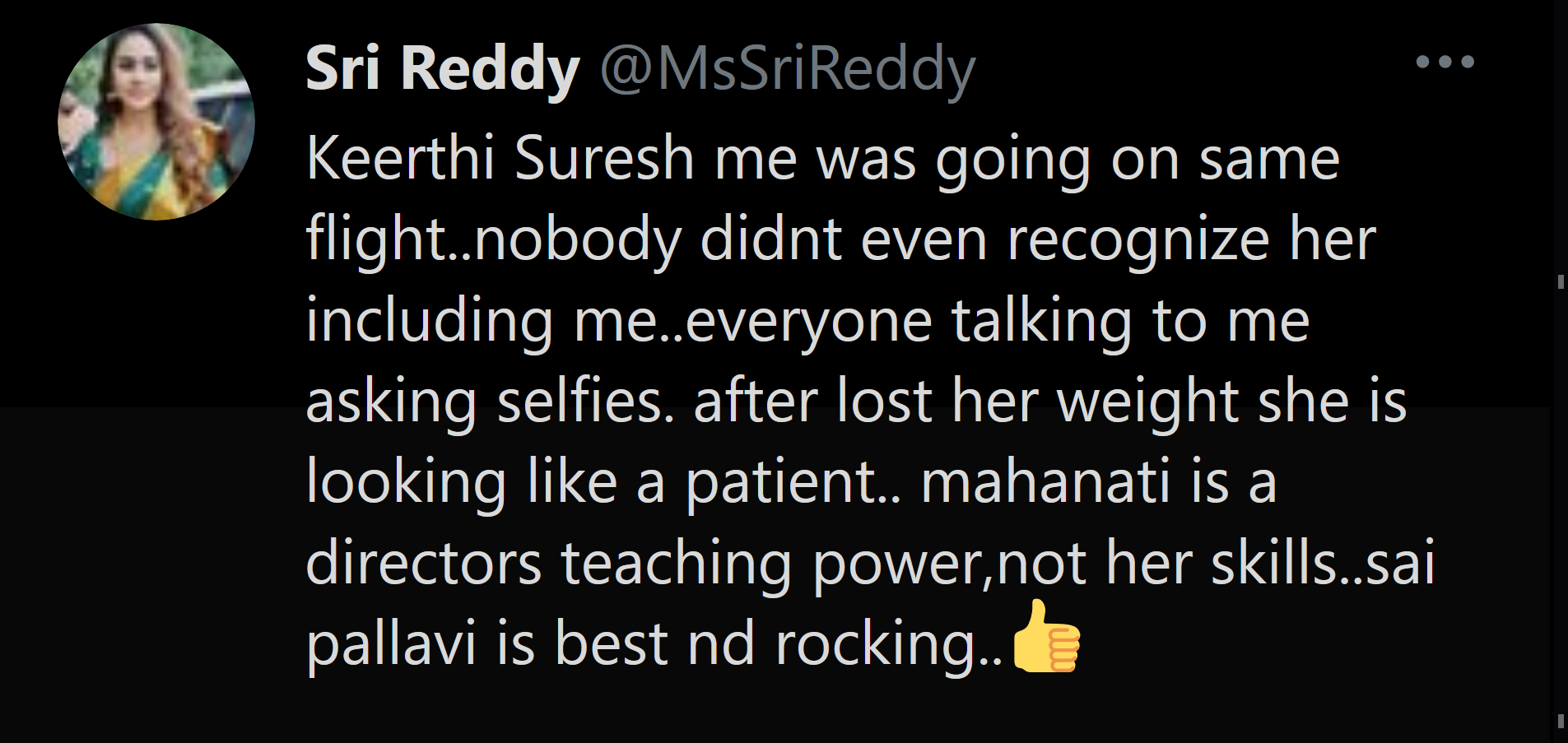 அந்தவகையில் தற்போது வெளியிட்டுள்ள பதிவு ஒன்று நெட்டிசன்களை முகம் சுளிக்க வைத்துள்ளது. தமிழில் முன்னணி நடிகையாக இருக்கும் கீர்த்தி சுரேஷ் நடித்த படம் பற்றியும், அவரது உடல் எடையை பற்றியும் கருத்து தெரிவித்து வம்புக்கு இழுத்திருக்கிறார் ஸ்ரீரெட்டி.