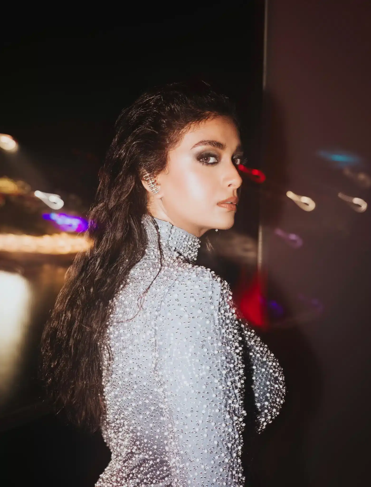 இந்நிலையில் தற்போது சாம்பல் நிறத்தில் உடை முழுதும் மின்னும் கற்கள் பதித்த படு மாடர்னான உடை அணிந்து கொண்டு தன்னுடைய மார்பு பகுதியில் பெரிய ஓட்டை போட்டு தன்னுடைய முன்னழகு எடுப்பாக தெரிவதை உறுதிப்படுத்தும் விதமாக போஸ் கொடுத்திருக்கிறார் அம்மணி.