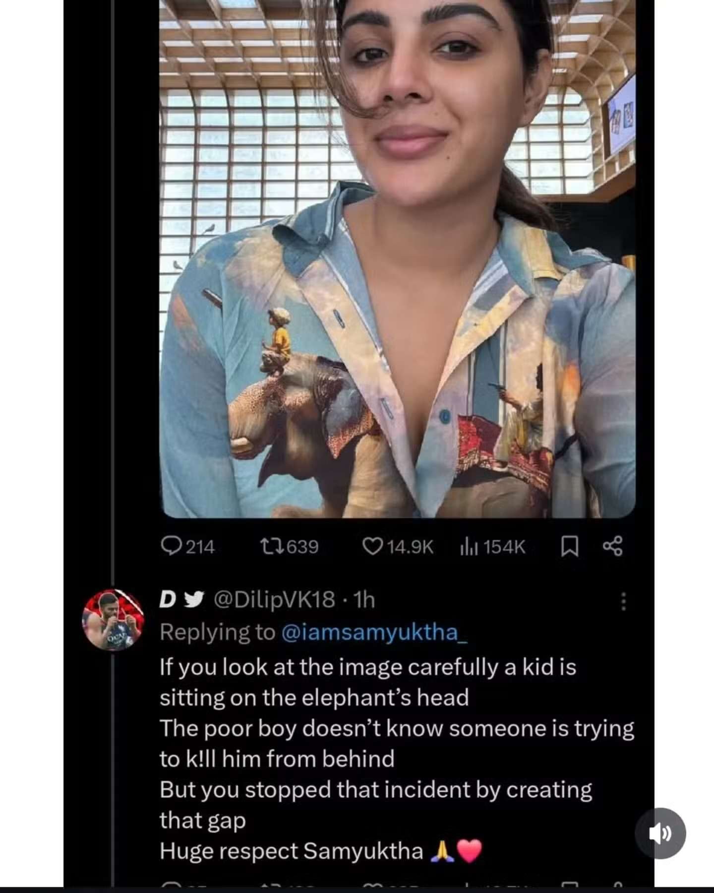 அவரின் துப்பாக்கி குண்டு அந்த சிறுவனை தாக்காமல் தடுக்க வேண்டும். எனவே, தன்னுடைய சட்டை பட்டனை கழட்டி விட்டதன் மூலம் அந்த நபருக்கும் யானை தலையில் அமர்ந்துள்ள சிறுனுக்கும் இடையே மிகப்பெரிய இடைவெளியை ஏற்படுத்தி அந்த சம்பவத்தை நடக்க விடாமல் தடுத்திருக்கிறார் நடிகை சம்யுக்தா மேனன்.. எவ்வளவு பெரிய மனசு பாருங்கள்.. என்று நடிகை சம்யுக்தா மேனனின் இந்த சட்டையின் கதையை சொல்லி இருக்கிறார் ஒரு இணையவாசி.