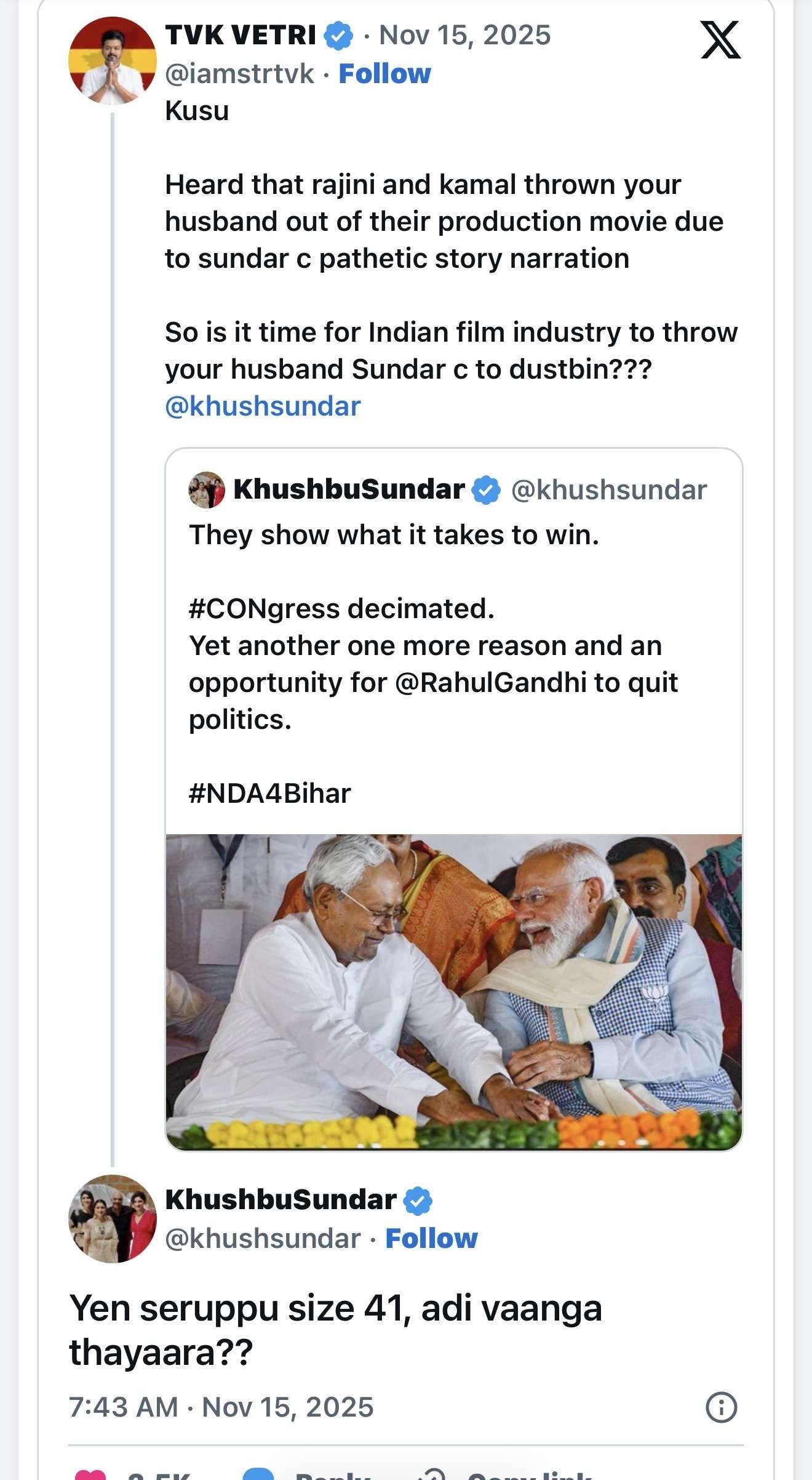 இந்திய சினிமா உலகம் உங்கள் கணவரை குப்பை தொட்டியில் போட்டுவிட்டார்களே என்று ஒரு கருத்தினை எக்ஸ் தளத்தில் பகிர்ந்துள்ளார். இதனை பார்த்த குஷ்பூ, என் செருப்பு சைஸ் 41, அடி வாங்கத் தயாரா என்று கூறி தக்க பதிலடி கொடுத்துள்ளார்.