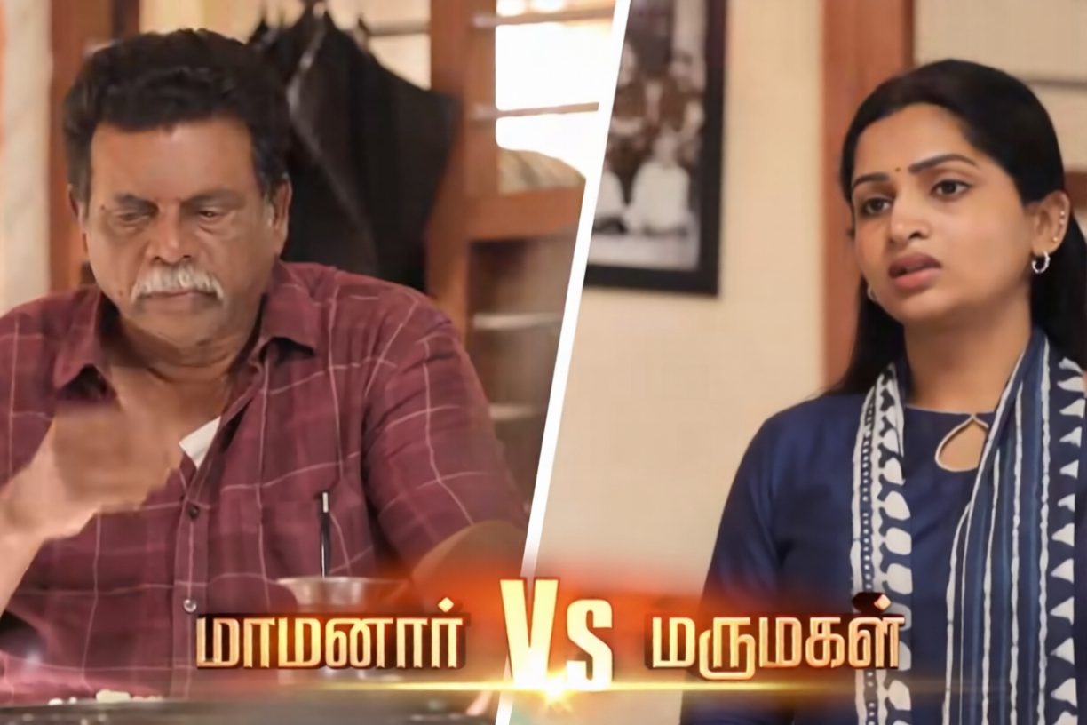 அதனால் சாப்பிடும் போது எல்லோருக்கு அருகிலும் ஒரு தட்டு கொண்டு வந்து வைக்கிறார். ஆனால் நான் சம்பாதித்து கட்டிய வீட்டில் தரையில் கருவேப்பிலை வைக்க கூட உரிமை இல்லையா என மாமனார் ஆணாதிக்க மனநிலை உடன் மோசமாக பேசுகிறார்.