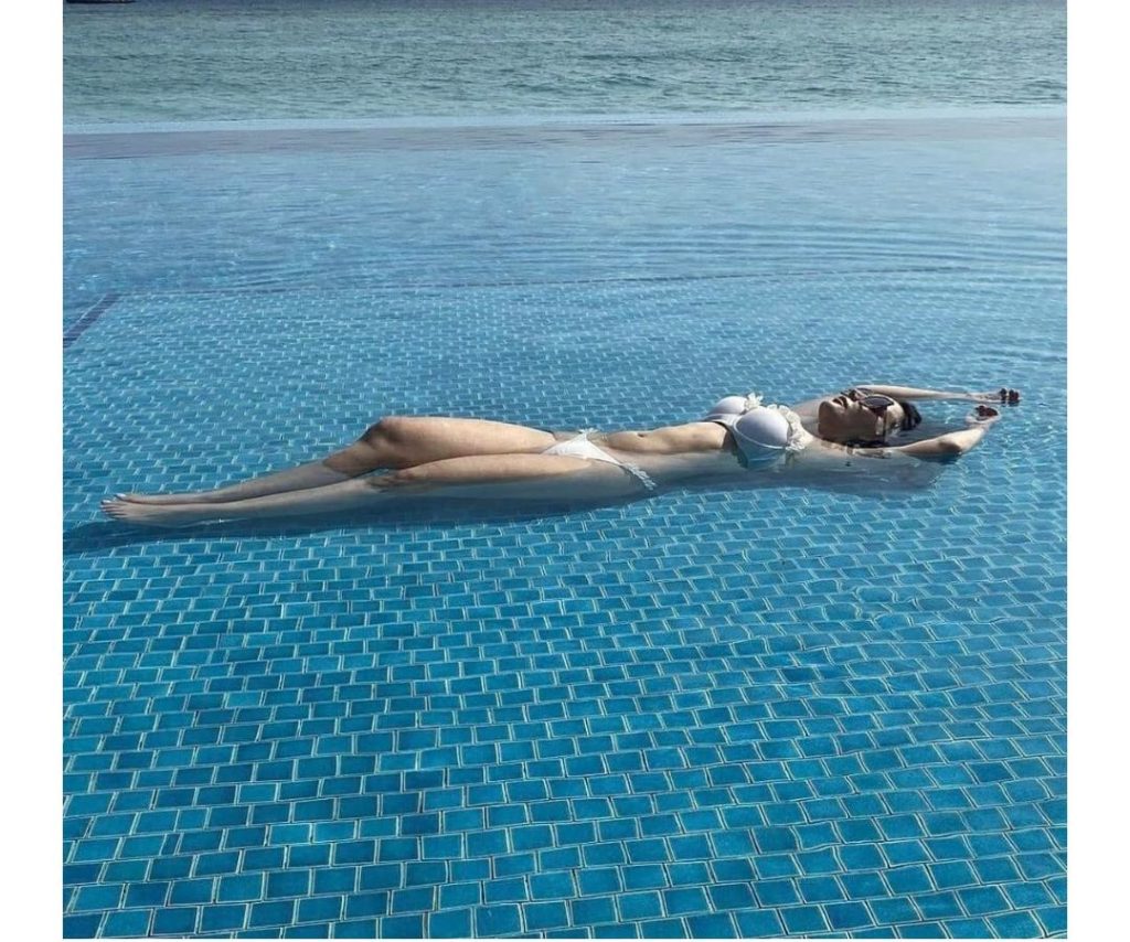 இந்நிலையில், டூ பீஸ் நீச்சல் உடையில் நீச்சல் குளத்தில் மல்லாக்க படுத்துக்கொண்டு படு மோசமான கவர்ச்சி புகைப்படங்கள் சில வற்றை வெளியிட்டு ரசிகர்களின் BP-யை எகிற வைத்துள்ளார் அம்மணி.