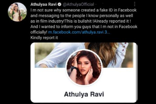 அதுகுறித்து தெரிய வந்த அதுல்யா, உடனே அந்தப் போலிக்கணக்கு குறித்து தன்னுடைய ரசிகர்களை எச்சரித்துள்ளார்.