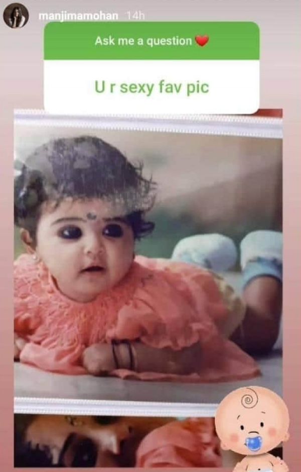 அப்போது ரசிகர் ஒருவர் மஞ்சிமா மோகனிடம் அவருடைய கவர்ச்சி புகைப்படத்தை அனுப்பு சொல்லி கேட்டுள்ளார். அதற்கு கொஞ்சமும் தாமதிக்காமல் மஞ்சிமா மோகன் தனது குழந்தை வயது புகைப்படத்தை அனுப்பி அவருக்கு பதிலடி கொடுத்துள்ளார்.