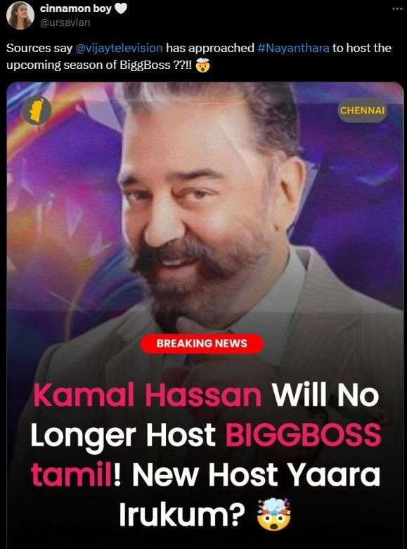 அவருக்கு பதில் இனி யார் தொகுத்து வழங்குவது என்ற கேள்வியும் ரசிகர்கள் மத்தியில் எழுந்து வந்த நிலையில், கமலுக்கு பதில் யார் தொகுத்து வழங்கப்போவது என்ற தகவல் இணையத்தில் பகிரப்பட்டு வைரலாகி வருகிறது.
